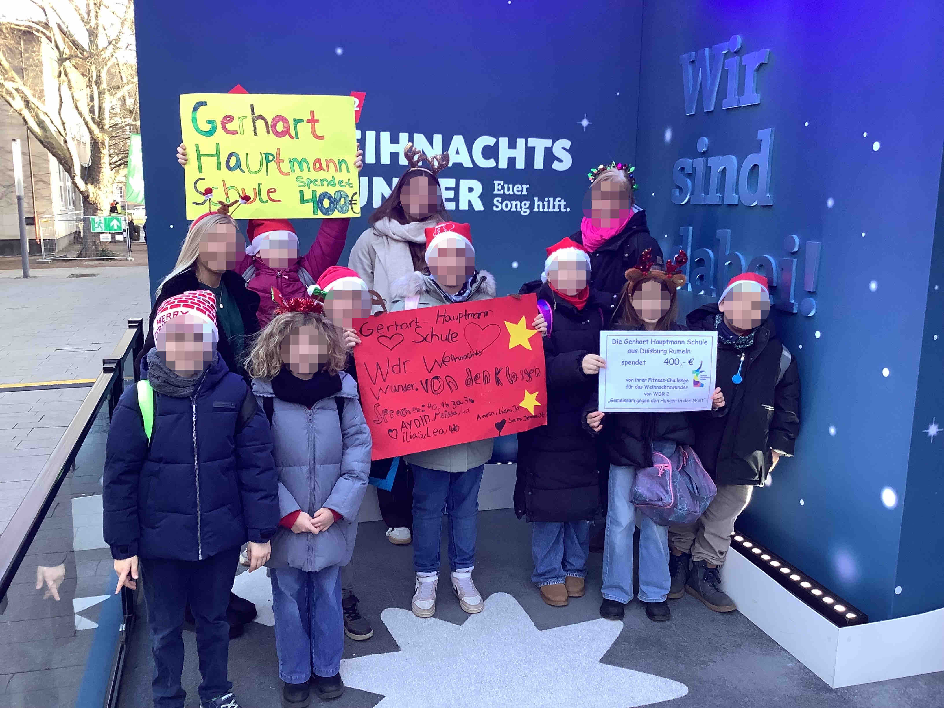 Zudem haben unsere Klassensprecherteams aller Klassen auf der Klassensprecherkonferenz beschlossen, 400€ von der Fitness-Challenge an das WDR 2 Weihnachtswunder zu spenden. Unter dem Slogan "Gemeinsam gegen den Hunger in der Welt" werden mit den Spenden sowohl in Deutschland als auch weltweit Kinder, Frauen und Männer unterstützt, die von Hunger und Armut betroffen sind.