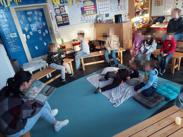 Überall in unserer Schule wurde vorgelesen: In allen Klassenräumen, Betreuungsräumen, in der Aula, Schulbücherei, in der Turnhalle und sogar in einer Flurnische trafen sich Kinder in jahrgangsgemischten Gruppen und hörten gespannt und entspannt etwa 17 Vorleserinnen und Vorlesern zu, auch in anderen Sprachen (Englisch, Russisch, Polnisch und Plattdeutsch!). In diesem Jahr bekam nämlich unser Schulteam eine große Unterstützung von der Johanniterhilfsgemeinschaft Duisburg-Krefeld-Niederrhein: 7 Ehrenamtliche lasen vor! Vielen Dank nochmal an dieser Stelle dafür!