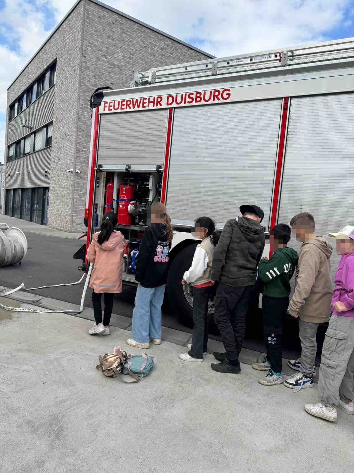 Am Montag, den 5. Mai 2025 haben wir, die Klasse 3b, einen spannenden Ausflug zur Feuerwache 6 in Rheinhausen gemacht. Wir durften in einem echten Feuerwehrauto mitfahren. Dann durften wir sogar mit einem Feuerwehrschlauch spritzen - das hat richtig Spaß gemacht!