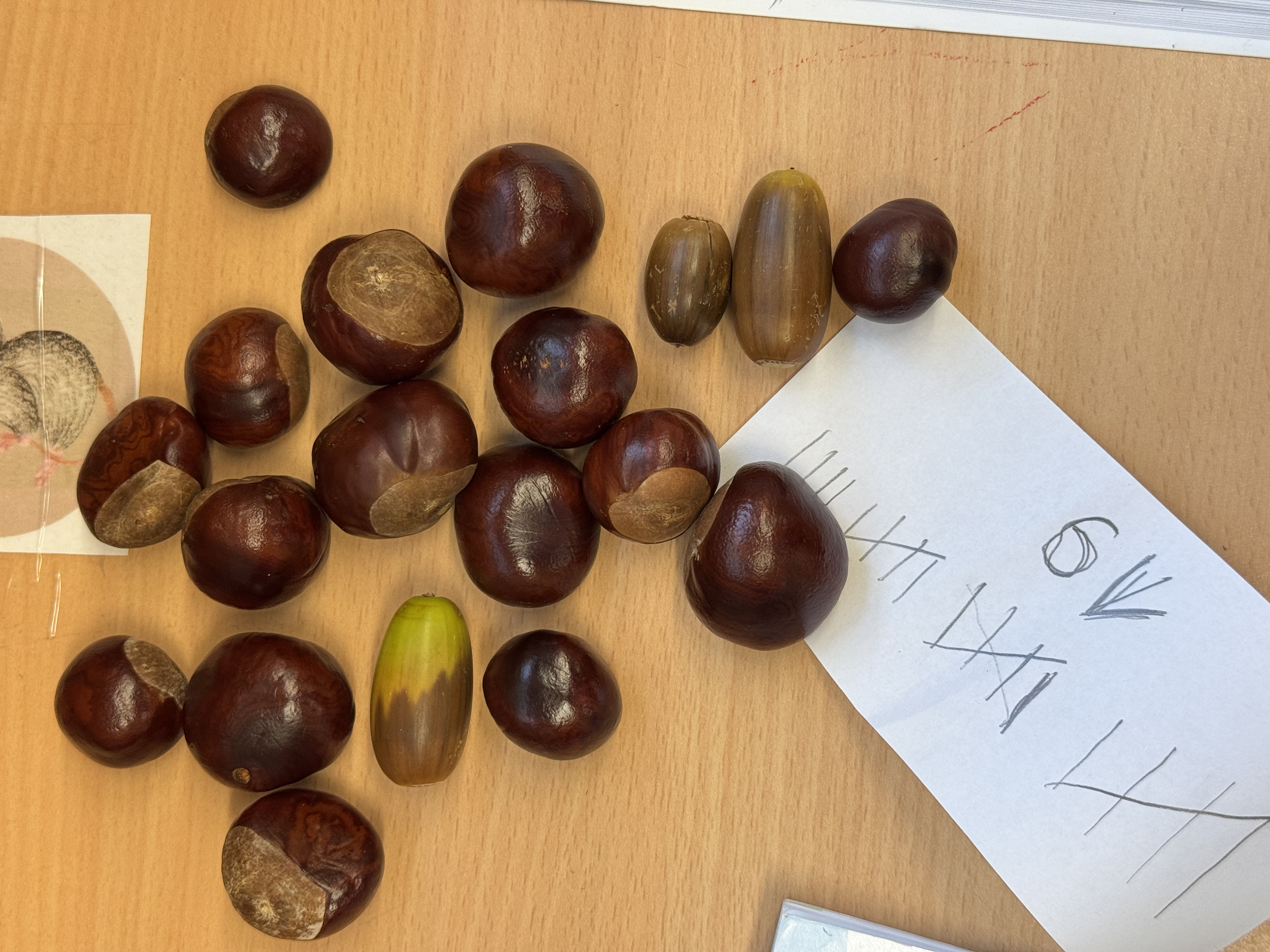 In den ersten Klassen haben wir im Matheunterricht mit Kastanien gezählt, Zahlen dargestellt, gerechnet und sie sortiert. Und nach den Ferien geht es dann ans Basteln mit Kastanien.